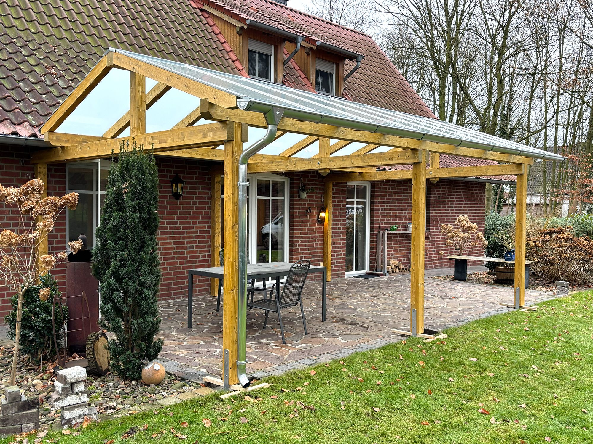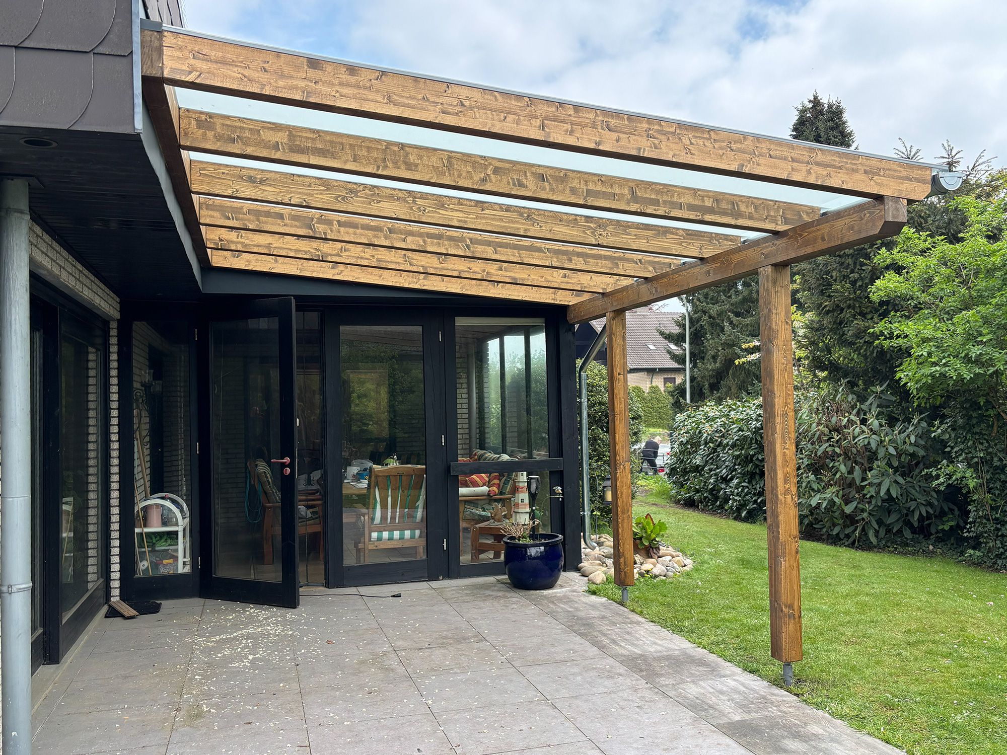 Ja. Jede Holzüberdachung wird von uns maßgefertigt und auf die architektonischen Gegebenheiten Ihres Hauses abgestimmt – sowohl in der Größe als auch im Design.